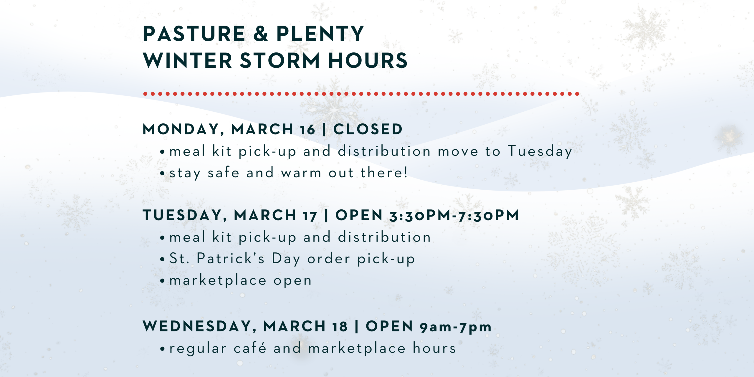 Please find parking for Pasture and Plenty behind our building on Highland Ave, in our parking lot next to the P&P Makeshop on University Ave, or there is street parking available in front of and around our building.