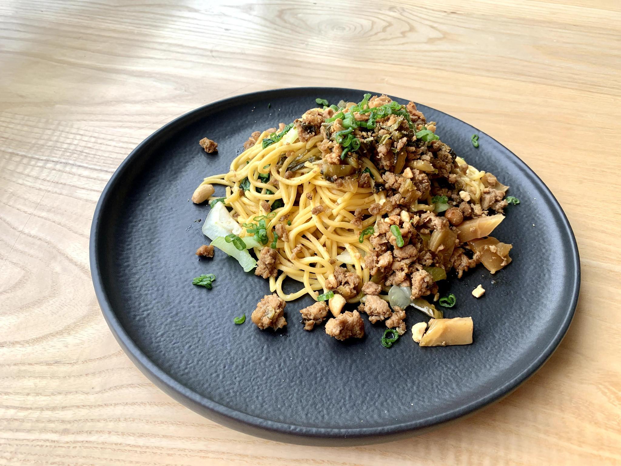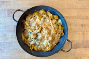 (V) Kimchi Mac and Cheese with Butternut Squash and Brussels Sprouts