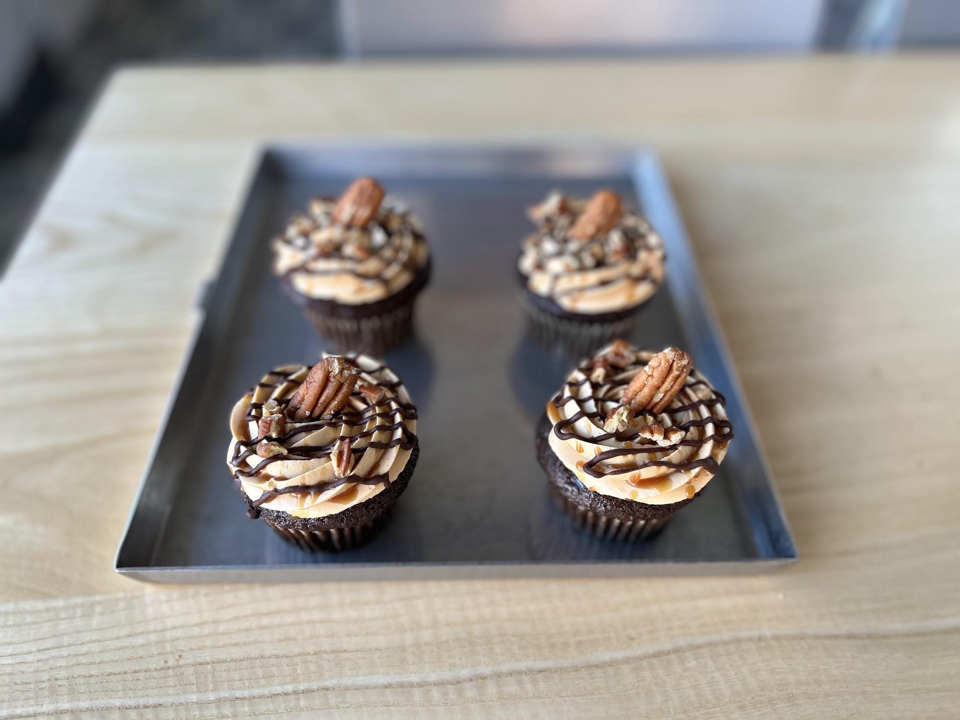 Turtle Cupcake: Chocolate cupcake (sugar, ap flour, milk, coffee, mayonnaise (soybean oil, water, whole eggs and egg yolks, vinegar, salt, sugar, lemon juice), oil, eggs, cocoa powder, salt, baking powder, baking soda), Caramel French buttercream (butter, sugar, egg yolks, water, caramel sauce, vanilla salt) Caramel Sauce (sugar, heavy cream, water, corn syrup, salt vanilla) fudge frosting (butter, chocolate, powdered sugar, corn syrup, cocoa powder, coffee, vanilla, salt) Salted Pecans (pecans, canola oil, salt) | Contains: milk, wheat, egg, Tree nuts (pecans)