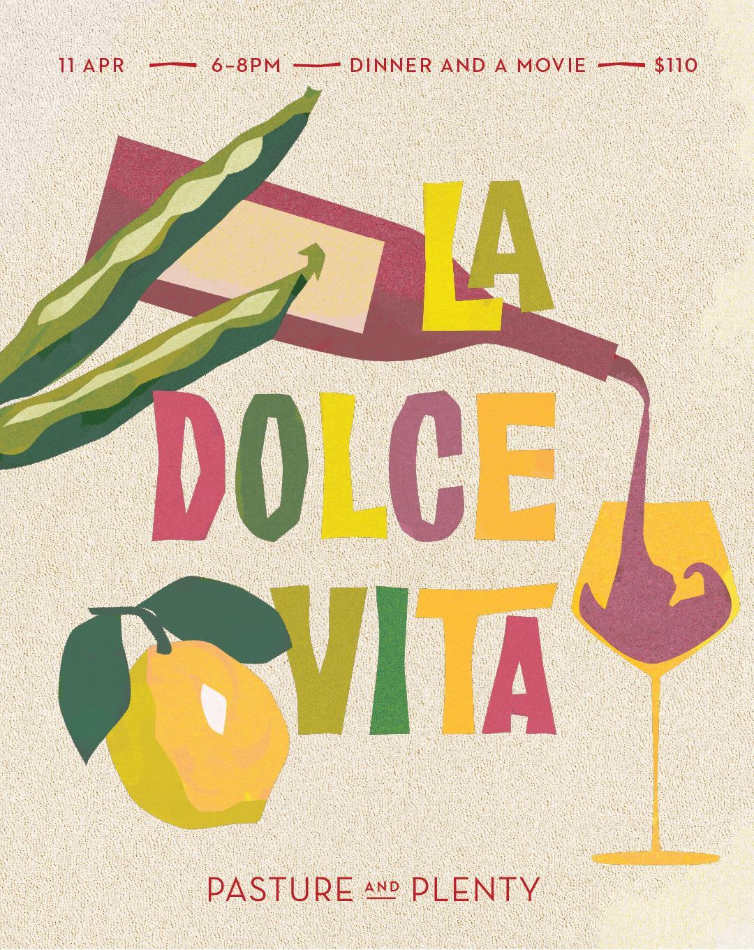 We’re excited to welcome you into our dining room for a dinner and a movie night! With a five-course plated dinner, drawing inspiration from La Dolce Vita, with a projection of the movie alongside, it’s sure to be a fun, and delicious, night!