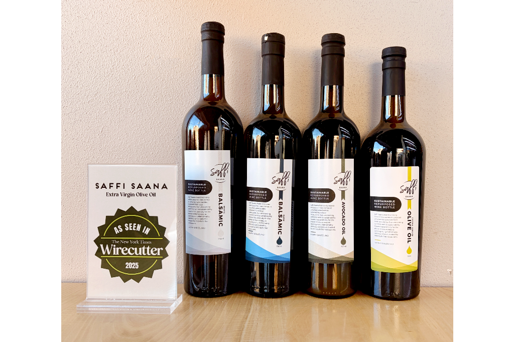 All of their “Zero Waste Products” are sustainably packaged in 25oz/750ml recycled glass wine bottles that Saffi Foods collects from local restaurants and wine shops. Glass wine bottles are fully recyclable and come with a reusable cork. Pick one, or all of the amazing options below: