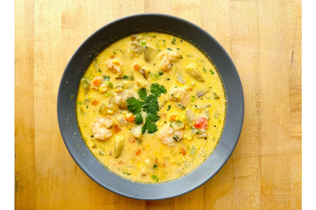 Ingredients: Vegetable stock, yellow onion, wild-caught Gulf shrimp, bell pepper, corn, celery, carrots, red potato, cream, jalapeño, red wine vinegar, lime, scallion, cilantro, cumin, coriander, cayenne, paprika, salt, pepper.