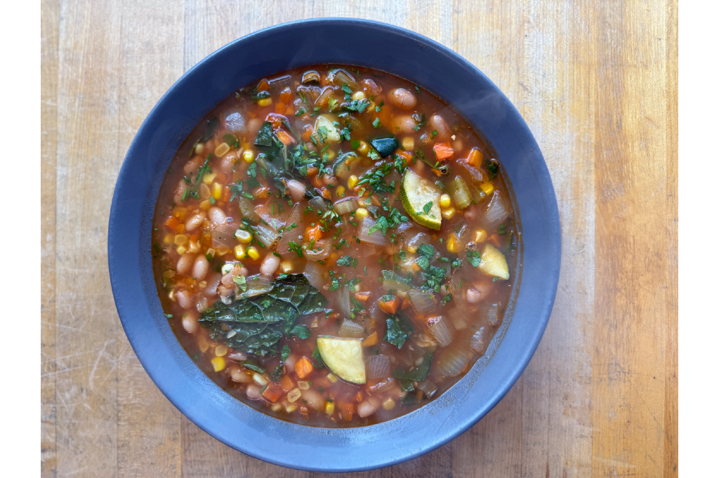 Ingredients: Vegetable stock, pinto bean, onion, carrot, celery, swiss chard, rainbow chard, kale, corn, zucchini, garlic, ginger, tomato paste, olive oil, smoked paprika, cumin, salt, pepper, red chile flake, lemon, herbs, sumac, citric acid.