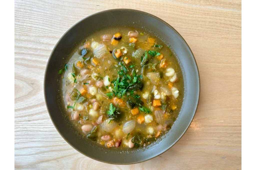 Ingredients: White bean, vegetable stock, onion, poblano pepper, sweet potato, green chile, tomatillo, corn, jalapeño, cumin, coriander, cilantro, lime juice, salt, pepper.