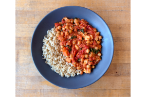 (V) Creamy Sun-Dried Tomato Chickpeas with Root Vegetables and Brown Rice